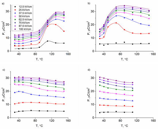 Temperature dependence of polarization at different electric fields for (1−x)(0.8NBT-0.2BT)−xCT compositions with x = 0.050 (a), x = 0.075 (b), x = 0.100 (c), and x = 0.125 (d), obtained from measurements of polarization current simultaneously with measurements of ΔT.