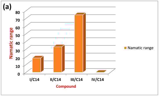 Figure 5 illustrates the relation between the type of the compact polar group of the prepared ILCs and the mesomorphic range (either smectic or nematic). A direct relationship can be noted between the type of terminal compact polar group and the mesomorphic range. For the high electronegative compact F-atom, the smectic mesophase is the dominant mesophase over the nematic one due to its high degree of intermolecular interaction that may enhance the existence of smectic over the nematic mesophase. However, the methoxy group of high mesomeric resonance effect with large space filling showed higher overall mesomorphic smectic range than the nematic mesophase. As indicated, due to the greater degree of alkyl aggregation of the methoxy chain, the smectic range increases [33,34,41].