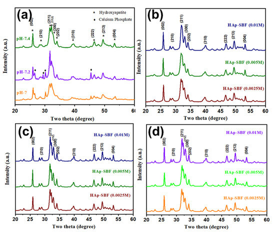 Powder XRD spectra of HAp and F-HAp (a): HAp synthesized in SBF at different pH values; (b): F-Hap synthesized in SBF at different concentrations of NaF; (c): HAp synthesized in SBF followed by 1 day soaking in solutions of different concentrations of NaF; (d): HAp synthesized in SBF followed by 3 days soaking in solutions of different concentrations of NaF.