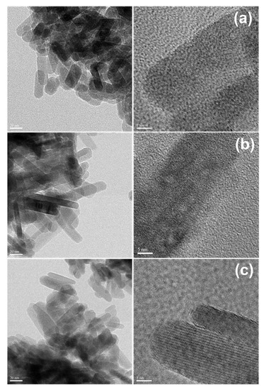 HRTEM images of F-HAp: (a) F-HAp synthesized in SBF at 0.01 M of NaF, (b) F-HAp synthesized in SBF at 0.005 M of NaF, and (c) F-HAp synthesized in SBF at 0.0025 M of NaF.