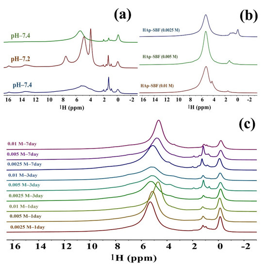 (a) 1H 35 kHz MAS NMR spectra of HAp synthesized in different pH values; (b) 1H 35 kHz MAS NMR spectra of F-HAp synthesized in BSF at different concentrations; (c) 1H 35 kHz MAS NMR spectra of HAp soaked in NaF solutions with different concentrations and different times.