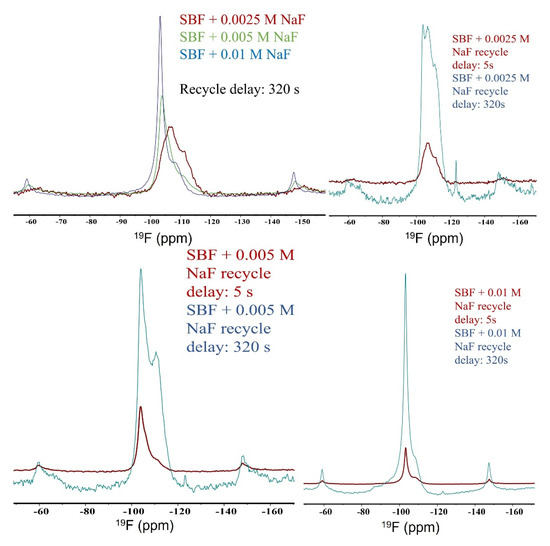19F 35 kHz MAS spectra of HAp synthesized in SBF and soaked in solutions at different NaF concentrations (2.5 mM, 5 mM, and 10 mM) for different recycle delays (brown: 5 s; green: 320 s).