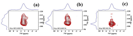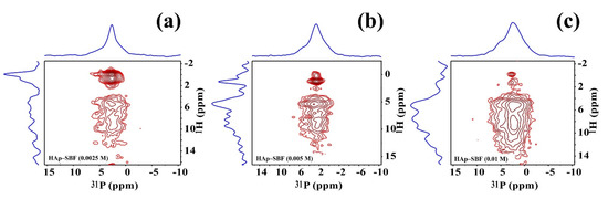 1H-31P 35 kHz HETCOR spectra of HAp synthesized in SBF and NaF solutions at different concentrations: 2.5 mM (a), 5 mM (b), and 10 mM (c).