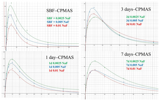 Hydroxycalcium phosphate was synthesized with pH = 7.4 according to the method described in Section 2.1.2.1, ground it into fine powder, and prepared in 0.0025 M, 0.005 M, 0.01 M NaF aqueous solutions. Then, 1 g of calcium hydroxyphosphate powder was put into each of the NaF solutions of different concentrations and soaked for 1 day, 3 days, and 7 days, respectively. Then, the samples were taken out, cleaned, and dried according to Step 3 and Step 4 of Section 2.1.2.1. The nine samples were labeled 1d-0.0025 M, 1d-0.005 M, 1d-0.01 M, 3d-0.0025 M, 3d.0005M, 3d-0.01 M, 7d-0.0025 M, 7d-0.005 M, and 7d-0.01 M.