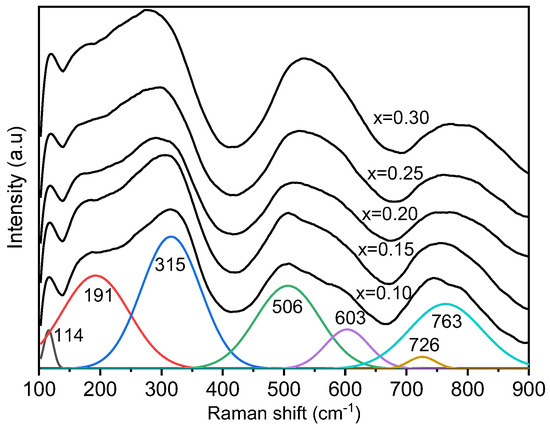 For a better understanding of the local structure, room temperature Raman spectra of BT–BMT–NN ceramics were recorded as shown in Figure 2, which is consistent with the data previously reported for BT-BMT [34]. The Raman bands were overlapped and became broader with the increase of NN content, indicating the disorder in the lattice induced by the multiple ions at the same site [46]. For a better illustration, the Raman spectrum was fitted using a simple Lorentzian function, as shown in Figure 2. The first sharp peak at 117 cm−1 and the second band near 180 cm−1 was related to vibrations of A-site cations and displacement [47]. The band near 180 cm−1 shifted to lower wavenumber, probably due to the incorporation of Na+ for Bi3+ with different ionic sizes [45]. In pure BT, a sharp peak appears near 305 cm−1 along with a dip near 180 cm−1 which is indicative of long-range ferroelectric order. In the present case, a relatively broader band at 335 cm−1 and another band near 281 cm−1 appeared (polar BO6 octahedral vibrations), and starts merging with increasing x-value [48]. This behavior may be associated with the destruction of ferroelectric order and the broadening may be related to the formation of polar-nano regions due to multiple cations at the same site of the lattice. The Raman bands in the range 400 to 650 cm−1 are often related to the vibrations of oxygen octahedrons [46]. In the present case, two different bands at 497 and 575 cm−1 were observed which merged with an increase in x. The possible reason for this behavior may be the stretching symmetric vibrations of TiO6 and MgO6 octahedra because ionic radii difference is large between Ti4+ and Mg2+. The substitution of Nb5+ resulted in a broad band which may be due to decreasing amount of Mg2+ because the ionic radii difference between Nb5+ and Ti4+ is small. The modes at 724 and 773 cm−1 merged to form a broad band. This band is known as A1g mode which is associated with the breathing of BO6 octahedra [49]. A1g mode is symmetric and Raman active in A-site doped BT but the splitting comes from the different octahedra because the frequency of this mode changes with change in ionic radius which creates asymmetry [50].