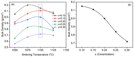 The samples were sintered in the temperature range 1050–1125 °C for 2 h (Figure 3a). For all samples, the bulk density increased with an increase in temperature from 1050 °C. For a sample with x = 0.10, maximum bulk density was observed at 1075 °C which decreased with a further increase in temperature. For samples with x > 0.10, the highest bulk density was observed at a sintering temperature of 1100 °C. The decrease in bulk density above optimal sintering temperature may be due to the volatile nature of bismuth or abnormal grain growth. However, for a better comparison, the samples sintered at 1100 °C (optimal sintering temperature) were selected for investigation because bismuth is volatile and a slight temperature change may affect the properties of the sintered ceramics. Figure 3b shows a variation in bulk density versus x (NaNbO3 concentration). The bulk density decreased with an increase in x which may be due to the decreasing amount of bismuth as the atomic weight of bismuth is higher than sodium.