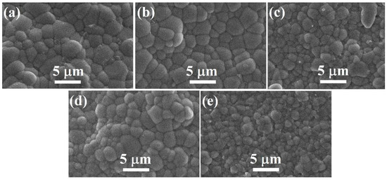 Figure 4 shows the SEM images of the polished and thermally etched BT–BMT–NN ceramics sintered at 1100 °C for 2 h. All the samples showed well-packed grains and dense microstructure, consistent with the high relative density (>94%). The average grain size was found to be quite small of 1–1.8 μm for samples with x = 0.10 to 0.30 (See Supplementary Materials Figure S1), which is, technologically, of great importance for the fabrication of MLCCs [51]. The average grain size and relative density of all the samples sintered at 1100 °C are given in Table 1. For a sample with x = 0.25, both the relative density and grain size were larger.