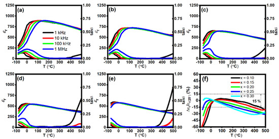 The εr and tan δ as a function of temperature for BT–BMT–NN ceramics measured at different frequencies from 1 kHz–1 MHz in a temperature range of −70 to 500 °C is shown in Figure 5a–e. The temperature of maximum εr (Tm) drastically decreased from 91 to −40 °C, with an increase in x from 0.10 to 0.30. A similar effect of decreasing Tm was reported for NaNbO3-modified BaTiO3-Bi(Zn0.5Ti0.5)O3 solid solution [52]. εr linearly decreased with an increase in Na+ and Nb5+ concentration which encouraged the short-range ferroelectric behavior. A similar trend was observed for (1 − x)NaNbO3–xBaTiO3 ceramics [53]. Another reason for the decrease in εr may be the smaller polarizability of Nb5+ than Ti4+. As evident from the P-E loops and Raman data, the crystal structure is cubic but still, εr is higher than centrosymmetric structures, such as CaTiO3 which may be attributed to the formation of polar nanoregions (PNRs) due to the occupancy of multiple cations at the same site [31].