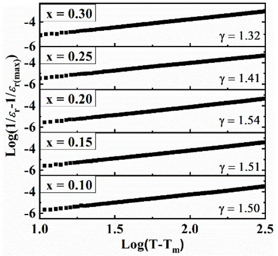 Here, ‘εm’ represents maximum εr, ‘γ’ and ‘C’ are constants. The value γ varies from 1–2 for normal to ideal relaxor ferroelectrics. γ is obtained from the slope of log(1/ɛ − 1/ɛm) versus log(T − Tm) as plotted in Figure 6. The value γ ranges from 1.32 to 1.54, indicating relaxor-like behavior. It has been reported [48,58] that cation disorder at the A- and/or B-site is responsible for relaxor behavior, in agreement with the Raman studies (Figure 2).