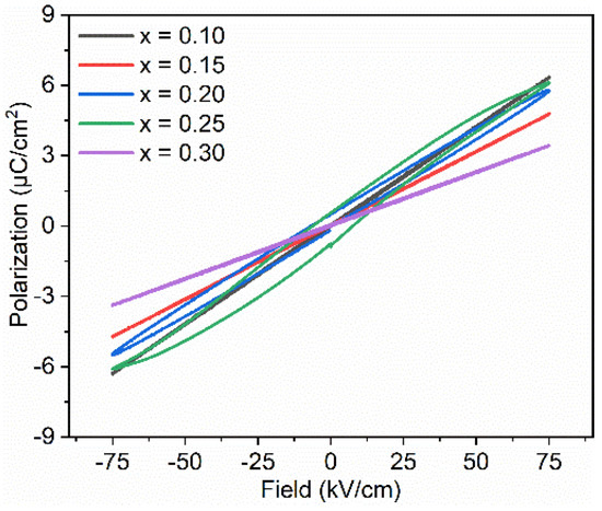 Figure 7 shows P-E loops for BT–BMT–NN samples measured at 75 kV/cm. The samples with x = 0.30 exhibited the lowest maximum polarization, Pm = 3.43 μC/cm2 while the maximum Pm value of 6.4 μC/cm2 was obtained for samples with x = 0.10. Similar behavior was observed in Na+ and Nb5+ doped Bi0.5Na0.5TiO3-BT ceramics [59]. The decrease in polarization may be due to the decrease in polarizability of the constituents. However, a non-linear trend was observed in Pm values for samples with x = 0.2 and 0.25. For both these two samples, an opening in the P-E loops was also observed which shows a weakly nonlinear dielectric behavior. The same phenomenon was observed for (1 − x)BT–xBMT (x = 0.4) ceramics which was attributed to the increase in the conductive tan δ at room temperature [33]. For BT–BMT–NN with x = 0.20 and 0.25, tan δ is very low (<0.025) at room temperature; therefore, the origin for the observed weak non-linear behavior needs further investigation. The recoverable energy density (Wrec) calculated for the sample with x = 0.10 was 0.5 J/cm3 at an applied electric field of 110 kV/cm. A maximum Wrec of 0.55 J/cm3 and an efficiency of 82% were observed for the sample with x = 0.25 at 150 kV/cm.