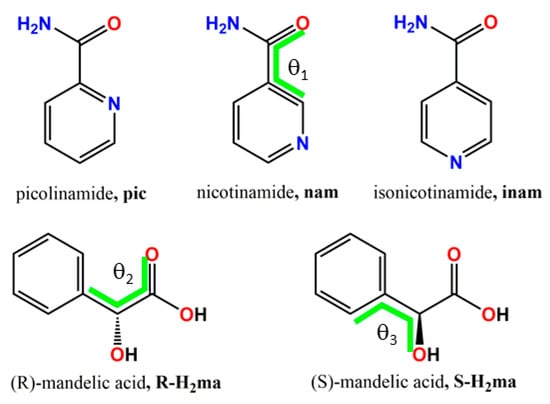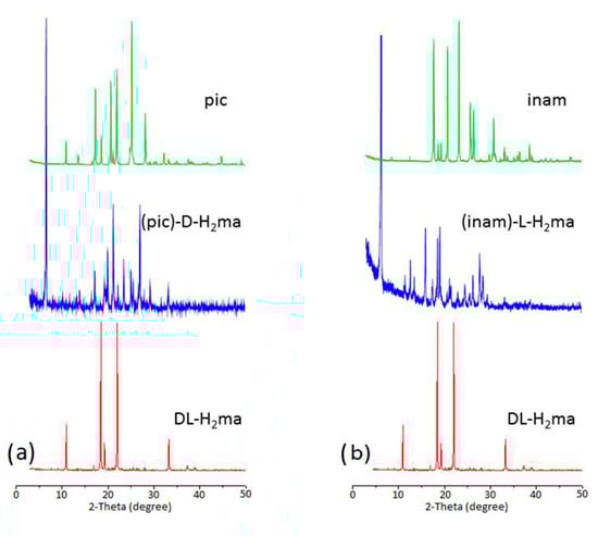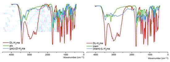 | Compound | (pic)-(D-H2ma) (1) | HOGGOB [31] | JILZOU01 (2a) [32] | JILZOU (2b) [33] | (inam)-(L-H2ma) (3) |