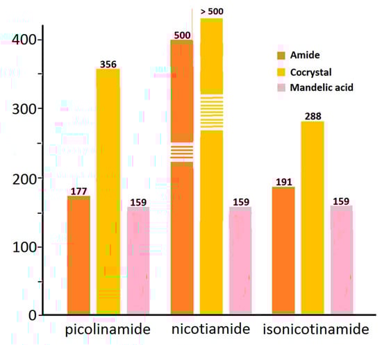 - Zhang, S.-W.; Guzei, I.A.; de Villiers, M.M.; Yu, L.; Krzyzaniak, J.F. Formation Enthalpies and Polymorphs of Nicotinamide−R-Mandelic Acid Co-Crystals. Cryst. Growth Des. 2012, 12, 4090–4097. [Google Scholar] [CrossRef]