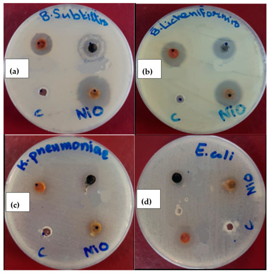 - Perachiselvi, M.; Jenson Samraj, J.; Bagavathy, S.; Feiona, T.A.; Krishnaveni, P.; Laksmi, E.P.; Swetha, V.; Leema, M.M.; Britto, S.J.; Annadurai, G. Fabrication of Nickel Oxide Nanoparticles for Ntibacterial and Photocatalytic Activity. Res. J. Pharm. Biol. Chem. Sci. 2018, 4, 749–760. [Google Scholar] [CrossRef]