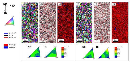 Figure 3 shows the inverse pole figure (IPF), grain boundary, and grain orientation spread (GOS) maps of the FGM and FGH Cu before DTE tests. ID denotes the powder injection direction. The average grain size of the FGM and FGH is 1.80 μm and 1.82 μm, respectively. The microtextures of both specimens are almost randomly distributed with an equiaxed shape. In addition, a noticeable fraction of Σ3 twin boundaries (ideal misorientation of 60°), indicated as red in both grain boundary maps, can be found, which explains the formation of annealing twins during the sintering and HIP treatment of the PIM process. Through the PIM and the supplemental HIP, the recrystallized microstructure can be well organized by decreasing the density of the deformation substructures. To investigate the recrystallized grains in both specimens, the GOS levels were calculated from the EBSD data, indicating that the recrystallized grains were within 1° of the GOS [11,12]. It is clearly observable that recrystallized grains, indicated by red in Figure 1c, are numerous in both the FGM and FGH specimens.