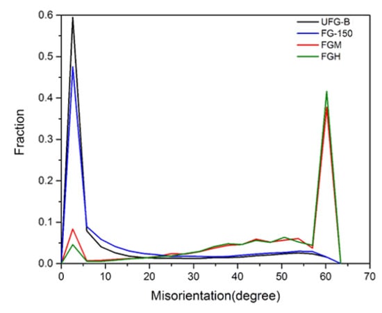 The recrystallized FG microstructures shown in Figure 3 in the present research are quite different from those of the UFG-B and FG-150 fabricated by the ECAP, shown in Figure 1, from the previous study [9], which showed UFG and FG microstructures with a high density of dislocation-related substructures developed due to severe plastic deformation [9,13]. To compare the density of the substructures clearly, the misorientation-angle distributions from the EBSD results for the UFG-B, FG-150, FGM, and FGH Cu are presented in Figure 4. In the UFG-B and FG-150, the majority of low-angle boundaries (LAB, 2° < θ < 5°) were initially developed due to the ECAP process. However, the FGM and FGH indicate that the density of high-angle boundaries (HAB, θ > 5°), including Σ3 CSL boundaries, is higher than that of UFG-B and FG-150. This implies that the deformation substructures and grain boundary character distribution, which are quite different for the two FG Cu groups fabricated by the PIM and ECAP, respectively, are factors that have major effects on the DTE behavior.