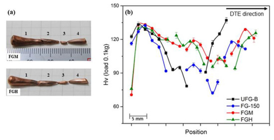 The DTE ductility calculated using Equation (1) is 372% and 386% for the FGM and FGH specimens, respectively, indicating their higher ductility than the UFG-B (279%) and similar quality to FG-150 (381%). Figure 5b shows the micro-Vickers hardness profiles of the fragments along the DTE direction. The hardness of Frag. 1 in all specimens initially increases to ~130 HV, exhibiting a peak, and then starts to decrease. Both UFG-B and FG-150 show a slight increase at the beginning of Frag. 1 and then decrease sharply as the DTE strain increases. The lowest hardness of the UFG-B (78 HV) is observed at the end of the conical remnant, and for the FG-150 it is 72 HV located at Frag. 3. These dramatic decreases can be explained by the occurrence of the mDRX [6,9]. On the other hand, the hardness profiles of the FGM and FGH fragments show a slight decrease but retain at a certain level above 90 HV, indicating that the mDRX behavior is retarded compared with that of the UFG-B and FG-150. All first exiting fragment specimens were recovered and their hardness were determined to the level of their conical remnants.