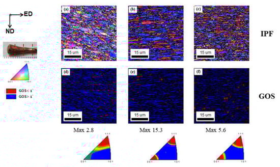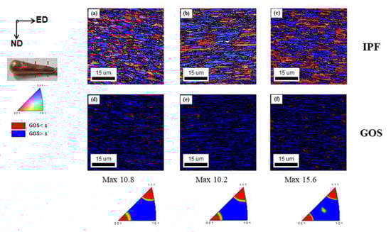 To verify the microstructural evolution during the DTE, EBSD measurements were performed on the FGM and FGH fragments. The regions of DTE strain levels of 0.5, 1.0, and 1.5, with respect to the initial projectile, were scanned where the positions corresponded to 3.8, 7.6, and 11.4 mm from the rear of the conical remnants. Figure 6 and Figure 7 present the inverse pole figure (extrusion direction) and GOS maps of the FGM and FGH Cu, respectively, at the DTE strain levels of 0.5, 1.0, and 1.5. Both specimens show a deformed microstructure with several elongated grains along the DTE direction and the development of strong dual <001> + <111> fiber textures. Several previous studies have reported this type of dual-fiber texture along the deformation axis on FCC metals and alloys subjected to a uniaxial process, such as extrusion or wire drawing [14]. The FGM and FGH fragments show that the fractions of both <001> and <111> components increase as the DTE strain increases without any extensive reduction, which is in contrast to the UFG-B fragment and indicates that the <111> fibers are replaced by the <001> fibers as a result of mDRX, as shown in Figure 5, Figure 6, Figure 7, Figure 8 and Figure 9 in the previous study [9].