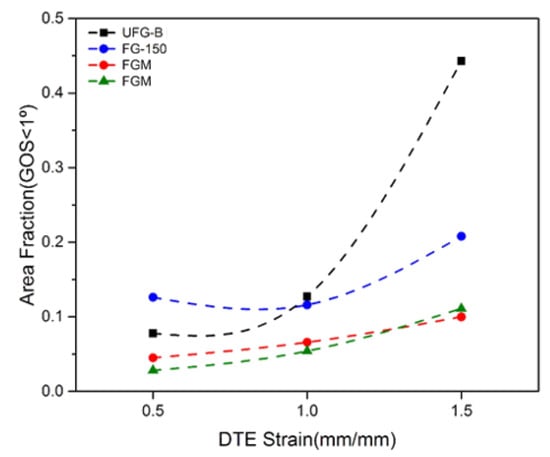 Fraction for which GOS < 1° with respect to the DTE strain for the UFG-B [9], FG-150 [9], FGM, and FGH Cu, respectively.