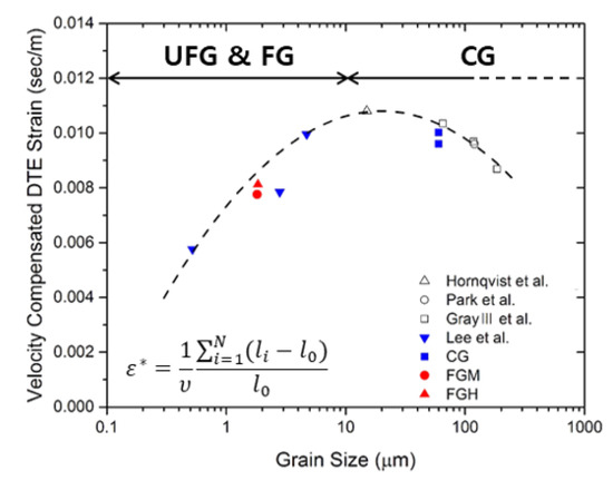 Velocity-compensated DTE strain of Cu as a function of initial grain size. The symbol of “*” means the velocity compensated DTE strain as represented in Equation (2) (△ Hörnqvist et al. [6], ○ Park et al. [5], □ Gray et al. [4], ▼ Lee et al. [9]).
