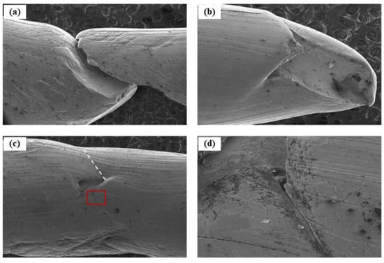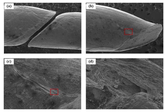 However, in the present study, the FGM and FGH show earlier failure facilitated between Frag. 1 and Frag. 2, as presented in Figure 5a. Thus, it can be considered that a different fracture mechanism during the DTE operates in the FGM and FGH Cu, different from the results of previous studies. Figure 10 shows the SEM micrographs of the FGM fragment surfaces near the fracture region. The fracture surface between Frag. 1 and Frag. 2 is clearly formed at an angle of 45 degrees with respect to the DTE direction. Furthermore, the fragment surface of Frag. 2 shown in Figure 10b,c indicates crack propagation at the shear localization site, marked by red. Cleavage planes along the failure region are also observed with a high magnification in Figure 10d. It is likely that the FGM fragments indicate void coalescence-dominated failure, which means that macroscopic localization and void coalescence occur simultaneously before strain/shear localization. Since the void remains in the initial FGM Cu, shown in Figure 1b, pore coalescence occurs during the DTE where the bandwidth is narrow, coinciding with the progression of plastic deformation, which induces a decrease in the DTE ductility.