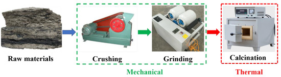 Figure 3 presents a schematic diagram of the composite activation procedure, which can be divided into three stages: crushing, grinding, and calcination.