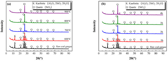 Figure 1, the main mineral compositions of the raw coal gangue were quartz, kaolinite, muscovite, illite, and chlorite. The steep diffraction peaks of kaolinite in
