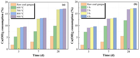 Ca(OH)2 consumption at different calcination temperatures (a) and holding times (b).