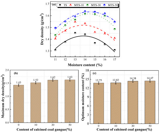 (a) Relationship of dry density and moisture content, maximum dry density (b), and optimum moisture content (c) at different CACG contents.