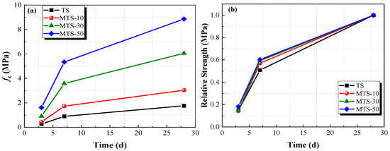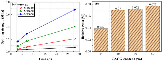 (a) Splitting strength of specimens at different curing times; (b) relative ratio.