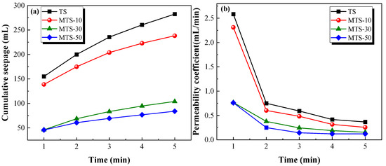 Cumulative seepage (a) and permeability coefficient (b) at different curing times.