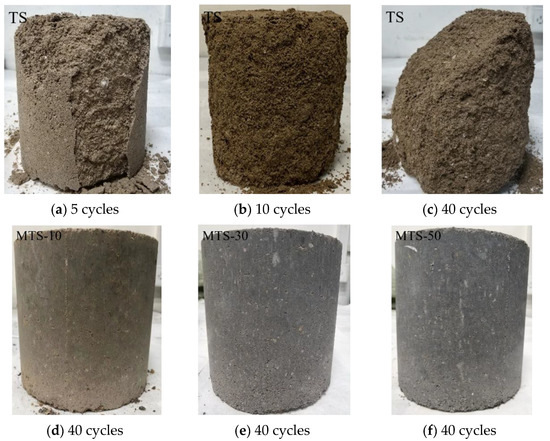 Table 6. Seven moisture contents (11%, 12%, 13%, 14%, 15%, 16%, and 17%) were set for each group. Firstly, all the materials were mixed evenly and sealed for 24 h. Secondly, the mixed materials were divided into five equal parts. The compaction experiment was carried out by using the layered compaction method, the number of hammering layers was set to 5, and the number of blows per layer was 27. Next, the specimens were removed from the mould and weighed, and samples were taken from the inside of the specimens. Finally, the samples were dried at 105 °C and the dry density of the specimens was calculated, as shown in Equation (2):