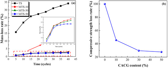 Mass loss rate (a) and compressive strength loss rate (b) in different freeze–thaw cycles.