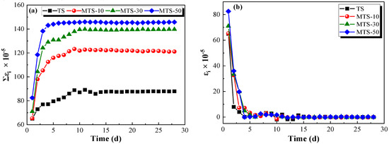 (a) Cumulative drying shrinkage strain (Σεi); (b) daily drying shrinkage strain (εi).