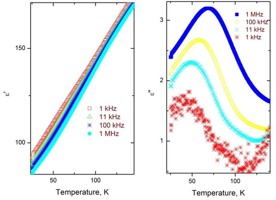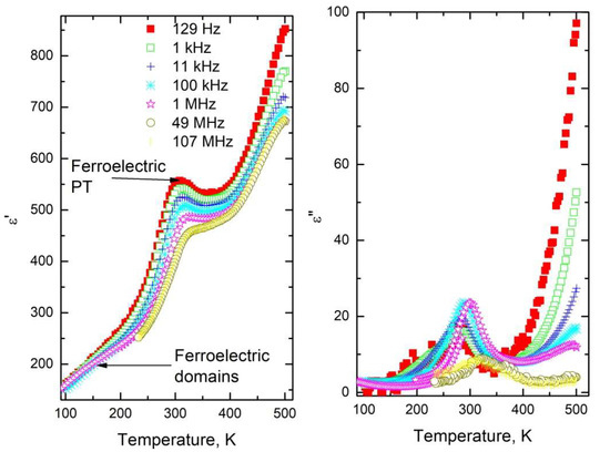 The complex dielectric permittivity as a function of temperature for ALN5 ceramics at different frequencies is presented in Figure 1. The local peak of the dielectric permittivity at 129 Hz is observed close to 303 K. The position of the dielectric permittivity peak occurs at higher temperatures when frequency increases. At higher frequencies, the dielectric permittivity anomaly becomes more diffused. Therefore, the dielectric dispersion is related to the dynamics of the dipoles and the dipoles fail to follow the electromagnetic field at higher frequencies due their finite relaxation time. Such behavior is not typical for classic ferroelectrics, for which the position of dielectric anomalies is frequency independent at low frequencies at least [34]. The position of dielectric losses’ maximum is also strongly frequency-dependent.