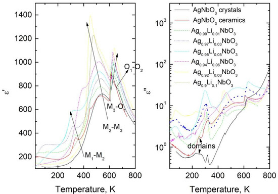 In Figure 2 we can see the temperature dependences of the dielectric properties of ALN materials at different lithium concentrations and a frequency of 1 MHz. The local peaks of the complex dielectric permittivity related to O1–O2 (close to 651 K for AN), M3–O1 (close to 610 K for AN), M2–M3 (close to 533 K for AN), and M2–M1 (close to 334 K) phase transitions are clearly observed in the temperature dependencies of ALN ceramics’ dielectric properties in good agreement with X-ray investigations of ALN [17,20]. Moreover, similarly to ALN5, the maximum complex dielectric permittivity below 200 K is connected with the ferroelectric domain’s dynamics. The dielectric anomaly close to 445 K, related to freezing temperature Tf [8], is observed only for AN. Dielectric anomalies related to O1–O2 and M3–O1 strongly shift to higher temperatures with higher lithium content, whereas the maximum of the complex dielectric permittivity connected to the M2–M3 phase transition shifts towards lower temperatures and becomes predominant. Moreover, the behavior of M2–M1 is complex, and for x ≤ 0.05 the anomaly shifts to lower temperatures, while for x = 0.06 the anomaly is observed at substantially higher temperatures, close to 380 K. At higher lithium concentrations, this anomaly is not observed. The dielectric losses at 1 MHz are quite low at all temperatures (lower than 55) and the increase in dielectric losses with temperature is observed only above 700 K and is related to the onset of electrical conductivity. Below 200 K the biggest dielectric losses are seen for samples with x = 0.05 and x = 0.03, as they are related to dielectric relaxation.