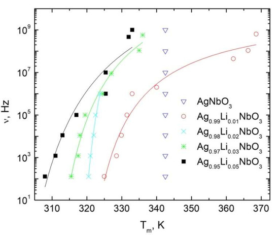 where Tm is the temperature of the dielectric permittivity maximum, ν0 is the frequency for Tm→∞; EA is the activation energy, T0 is the freezing temperature, and k is the Bolzmann constant. The calculated values of the parameters are enumerated in Table 1. The freezing temperature decreases when lithium concentration increases, while the dependence of EA and T0 is less expressed. The freezing temperature is related to the rms variance of the coupling of ferroelectric active dipoles [35]. Therefore, the disorder in interactions between ferroelectric active dipoles also decreases with lithium concentration. Moreover, the position of the dielectric permittivity maximum is frequency-independent for AN ceramics, indicating that the lithium ions cause the diffusivity of the ferroelectric phase transition.