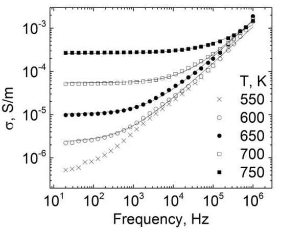Above 600 K, electrical conductivity effects become important. The frequency dependences of the electrical conductivity for ALN5 ceramics at various temperatures can be seen in Figure 4. The direct current (DC) electrical conductivity σDC (which is related to the frequency-independent plateau) can clearly be observed above 600 K. Moreover, on heating the specific frequency (the frequency at which electrical conductivity begins to deviate from the DC conductivity value) also increases with temperature so that the DC conductivity coincides with the conductivity measured at different frequencies over a broad frequency range. These spectra were fitted with the Jonsher universal dielectric response law [36]: