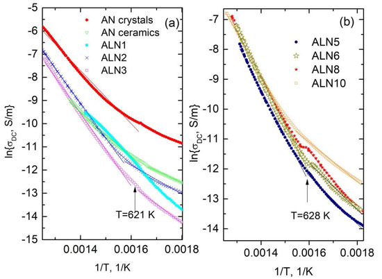 The temperature function of DC conductivity is presented in Figure 5. This quantity strongly increases with temperature for all ALN ceramics. However, it shows a slope change at 620 K, close to the M3–O1 anomaly temperature. Therefore, it was fitted separately below and above this temperature according to Arrhenius’ law: