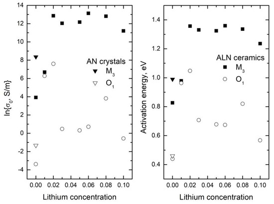 Pre-exponential coefficient and activation energy at different lithium concentrations for ALN ceramics and AN crystals.