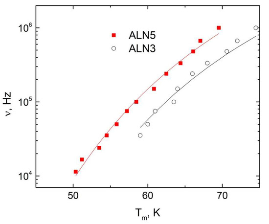 It is interesting that the dielectric anomaly for some ALN ceramics (ALN3 and ALN5) is seen at very low temperatures (below 100 K). For example, the temperature dependence of the dielectric permittivity of ALN5 at various frequencies in the low temperature region (at temperatures less than 150 K) is presented in Figure 7. The dielectric losses as a function of temperature show a clearly expressed maximum, which moves to higher temperatures with increasing frequency. A kink is expressed in the temperature dependence of dielectric permittivity, which is also frequency-dependent. What is the origin of this additional dielectric anomaly? It could be related to the dipolar glass behavior or ferroelectric domain dynamics [38]. These different behaviors can be separated by plotting the measurement frequency versus the temperature of the value of the greatest dielectric losses (Figure 8) [38].