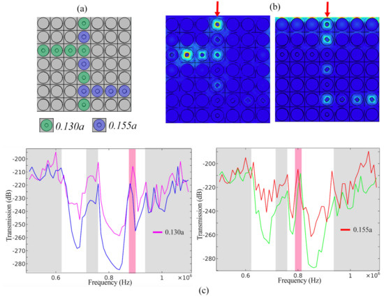 - Motaei, F.; Bahrami, A. Eight-channel acoustic demultiplexer based on solid-fluid phononic crystals with hollow cylinders. Photonics Nanostructures-Fundam. Appl. 2020, 39, 100765. [Google Scholar] [CrossRef]