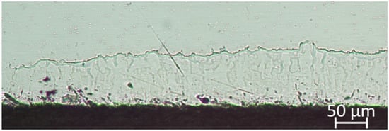 OM image of the sample N6-2 (62 years of service). Longitudinal section with a visible damaged layer (NSDL). The dark area is the technological substrate.