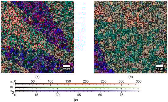 To study possible structural changes in the NSDL of Al wires, the measurements were carried out on longitudinal sections and cross-sections at two points of each sample, namely in the center of the section and at a distance of ~100 μm from the edge. To investigate the effect of the wires’ operating time on the wires’ grain structure, the sample N5 (new) and the sample N8 (after ten years of operation) were selected. The maps of distribution of Euler orientation angles φ1, Φ, and φ2 (correspondingly, angles of intrinsic rotation, nutation, and precession, see definition in []) with superimposed grain boundaries are shown in Figure 3 and Figure 4 for the transverse (near the edge of the samples) and longitudinal (near the edge for both samples as well as in the center for the N8 wire after ten years of operation) sections, respectively. Maps taken in the center of the facet for the cross-section of the two wires and the longitudinal section of the new sample N5 are presented in [] in Figure 8a,b,f, respectively. The color of a pixel on the maps corresponds to a combination of Euler angles describing the orientation of the crystal lattice at a given point. On longitudinal-section maps, the axis of the wire is directed vertically.