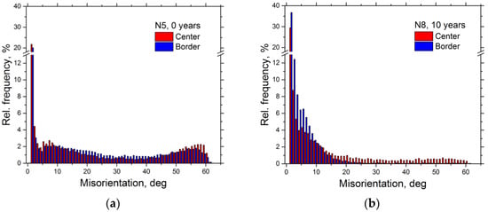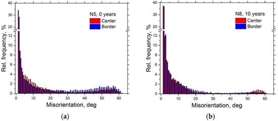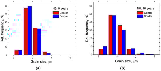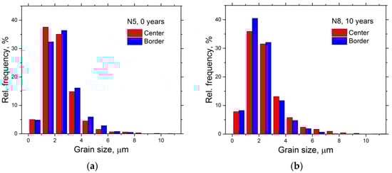 As a result of the analysis of the maps, grain-size distributions were built (Figure 5 and Figure 6). It can be seen that for both samples, new (N5) and after ten years of operation (N8), the size of most grains is 1-4 μm in the center (i.e., inside the wire) and near the edge in the longitudinal section and 1-3 μm in the center and near the edge in the cross section (Figure 5 and Figure 6). As noted earlier in [], for internal cross-sectional areas (i.e., in the center of the cross-section) of wires with a service life of up to 62 years, operation in an ambient air atmosphere conditions leads to a decrease in the number of grains from 1 to 3 μm in size and the formation of a small number (<1% relative frequency) of larger grains from 3.5 to 5 μm in size. For the edges of the cross-section, this effect looks more pronounced (about 3%), and the maximum grain size increases to ~6 μm (Figure 5b). A similar effect after the operation of the wires is observed for the longitudinal section. Along with a decrease in the number of grains with dimensions of 1 to 4 μm in the center and on the edge, a larger number of grains (~2–3%) of even larger size ~6 to 10 microns is formed, and there are more such grains in the center of the longitudinal section (cf. Figure 6a,b).