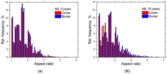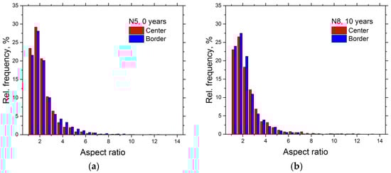 Figure 7 and Figure 8 present the histograms of the distribution of the aspect ratios of grains (the ratio of the maximum grain size to the minimum one). It can be seen that the aspect ratio of most grains is one to eight for longitudinal and one to four for cross sections, both for the center and for the edge of the sample, for new and after ten years of operation. Thus, the grains have an elongated shape along the axis of the wire (corresponding to higher values of the aspect ratios) relative to the cross-section, which is retained during the operation of the wire.