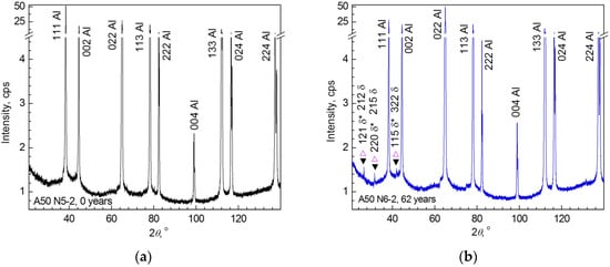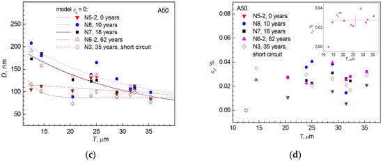 The microstructure characteristics obtained from the FWHM of the XRD reflections are the average sizes D of the X-ray coherent scattering areas (CSAs, also called crystallites) and the absolute values of the average microstrains εs in them. When reflections are broadened due to the size of crystallites and microstrains, the values of D and εs can be determined by graphical methods, namely Wilson–Hall plot (WHP) or size-microstrain plot (SSP), in procedures depending on the reflection-profile type, namely either Lorentzian, Gaussian, or pseudo-Voigt (pV) ones [,]. For all investigated samples of Al wires, the profile-criterion-coefficient values averaged over different reflections were obtained, FWHM/Bint = 0.80(6) − 0.84(8) (see []), which corresponds to the reflections of the pV type [] (here Bint = Iint/Imax is the reflection integral width). In [] using the WHP and SSP methods, it was shown that microstrains develop in the near-surface layer with a depth of ~36 μm with an increase in the service life of wires after 10 years of operation to a value of εs~0.30% (this is the absolute value of microstrain averaged over all depths up to ~36 μm from the surface), then only slightly changing up to 62 years of operation.