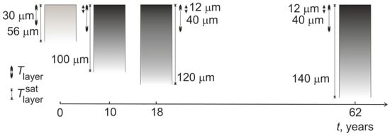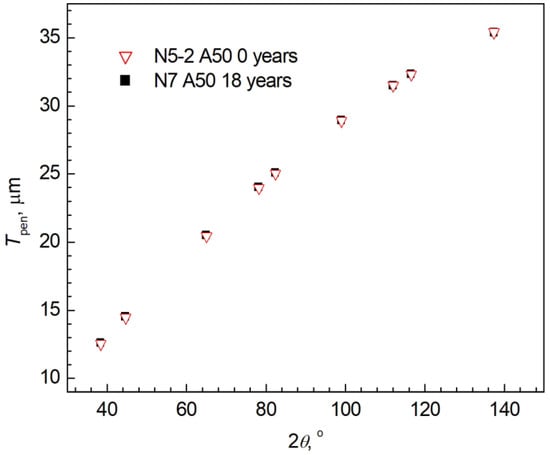 However, any graphic method requires two reflections at least. Since each X-ray-penetration depth is characterized by only one hkl reflection, the crystallite size D at depths down to was estimated in a model without microstrains (εs = 0) according to the Scherrer’s law with the coefficient KScherrer = 0.94 [],
