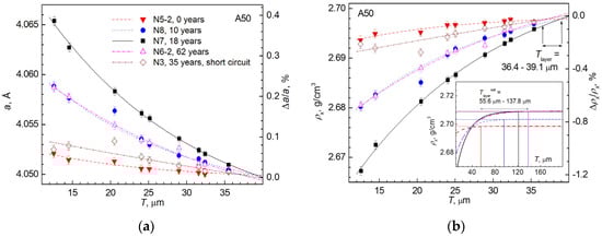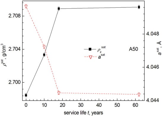 where ρx0 is the density in the bulk of the new (0 years of service) sample. In a similar way, along with the absolute value of the parameter a of the cubic unit cell of the Al material, the defect (relative change) of the lattice parameter Δa/a at the depth was calculated,