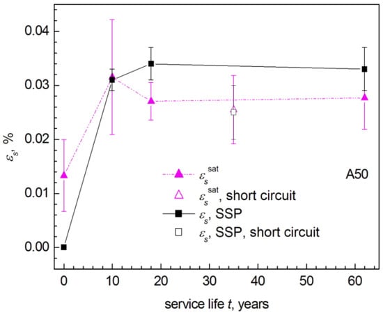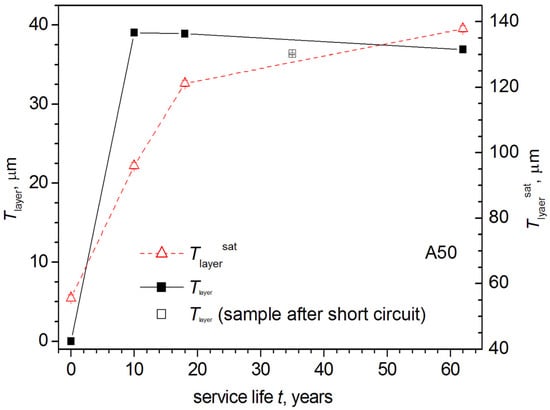 Individual wires of the new ACSR and AAAC cables of overhead power lines that served from 10 to 62 years without damage in the Volgograd region of Russia were studied in [] using X-ray spectral microanalysis (EDX), electron backscattered diffraction (EBSD), X-ray diffraction (XRD), densitometry, and acoustic resonance methods (in that paper, ACSR and AAAC cables are designated as AC50-type and A50-type cables, respectively). Besides, a cable was investigated by the same methods after a break appeared as a result of a short circuit after 35 years of service. The formation of crystalline δ- and/or δ*-Al2O3 was shown by XRD methods in the wires’ NDSL up to 36 μm thick. The average density of the NSDL (calculated from the XRD results) as well as the integral density in the bulk of wires (according to the results of densitometric measurements) was found to decrease with increasing service life up to about 35 years, then beginning to grow, which correlated with an increase in the volume fraction of crystalline aluminum oxides. The character of the change in the Young’s modulus, microplastic flow stress, and decrement with an increase in the service time of the wires indicates complicated structural and microstructural changes in them. In the sample after a short circuit, the NSDL relaxed to a state in a new cable (to its structural and microstructural characteristics), while relaxation in the bulk does not occur.