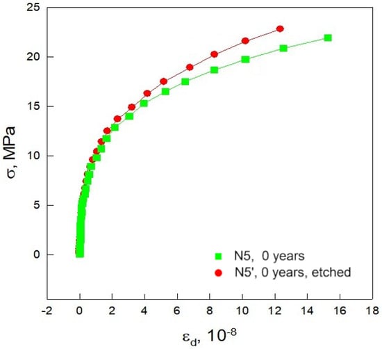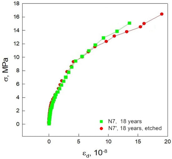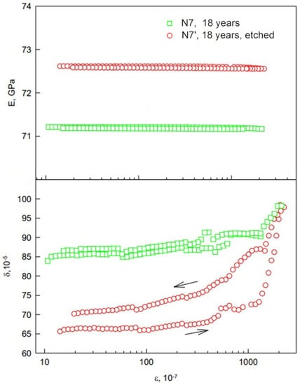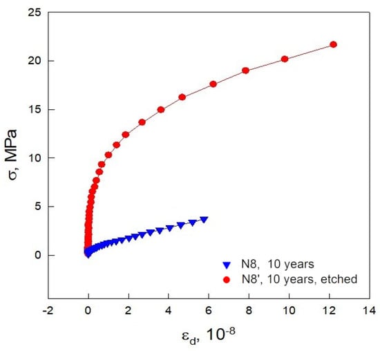 Acoustic measurements in a wide range of amplitudes also make it possible to evaluate the mechanical (microplastic) properties of materials in the coordinates “stress–inelastic strain”, which are usual for mechanical tests, when the value of the amplitudes of vibrational stresses σ is plotted along the ordinate